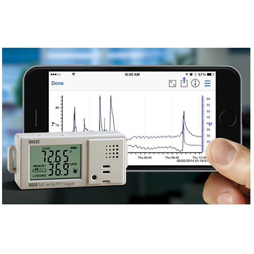 HOBO MX1101無線溫濕度記錄儀采用藍牙(Bluetooth)無線數據智能傳輸技術,能夠將其測量的室內溫濕度數據直接傳輸至手機,省去了繁瑣的數據線連接問題,很大地提高了數據收集效率。